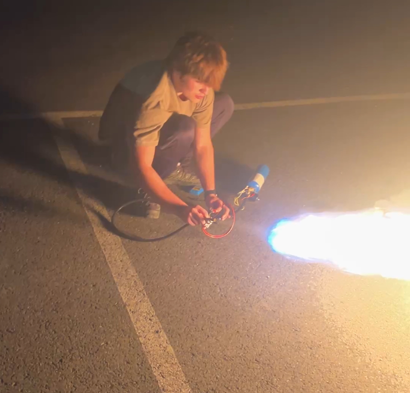 A propane cylinder supplies fuel, which then passes through an on-off valve, then a solenoid, then a hose, then an exit nozzle. The solenoid is powered by a 12V rechargable battery pack, and connected to a lever switch. The exiting flow is ignited by a separate ignition system, a grill lighter. PTFE tape was used on connections to prevent fluid leakage. The design is by no means elegant, but it is effective.